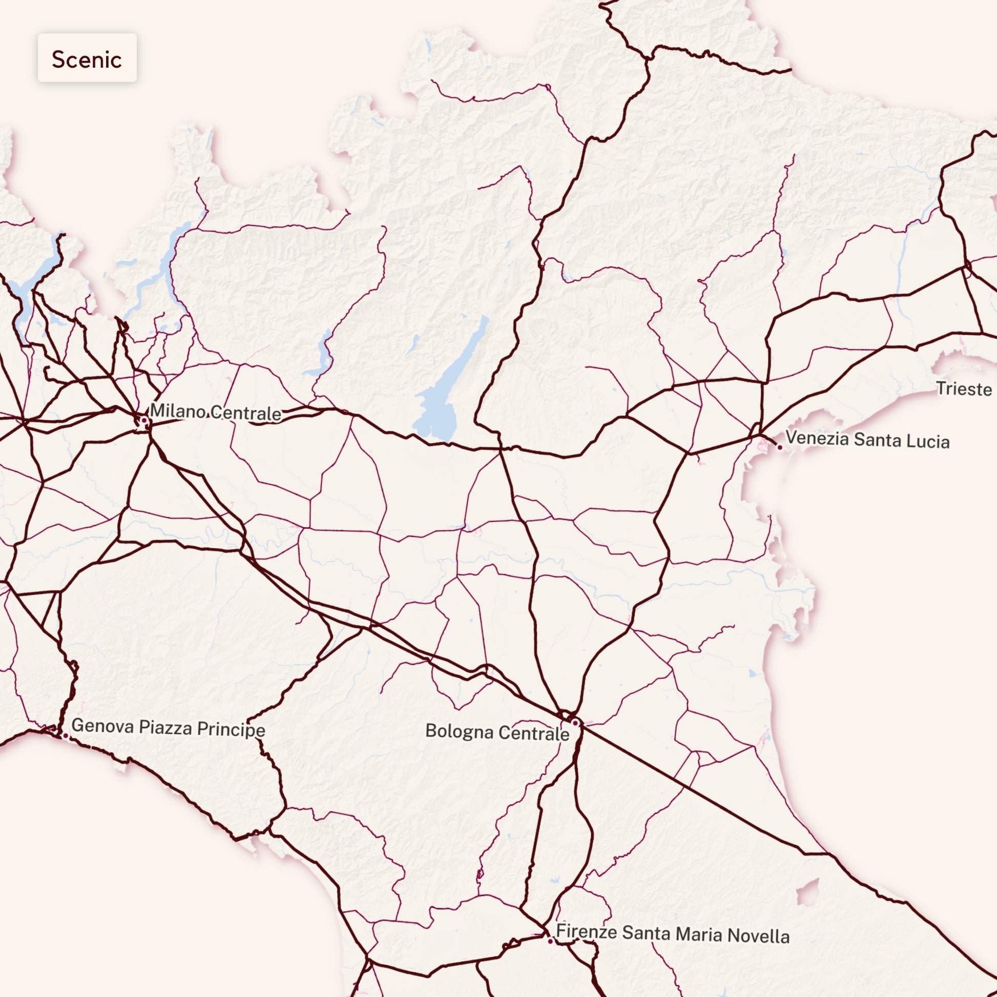 - Scenic: Explore further with added details – terrain, water features, main station labels, and country borders – for a richer experience.