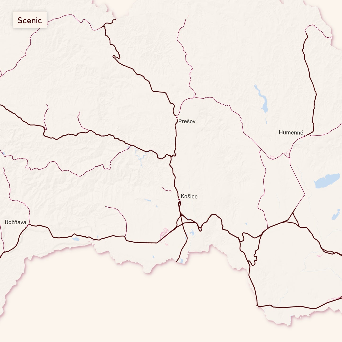 • Scenic: Explore further with added details – terrain, water features, main station labels, and country borders – for a richer experience.
